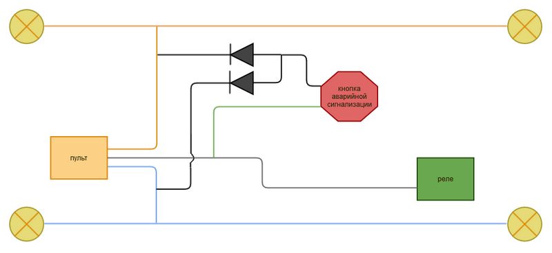 Желтые кругляши с крестиками на схеме - поворотники. Оранжевый провод - левые поворотники, голубой провод - правые поворотники.